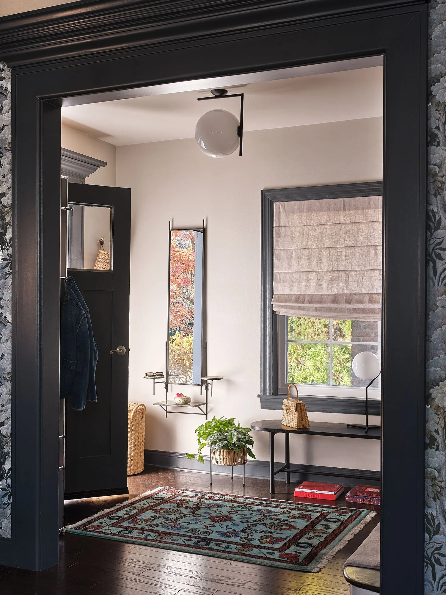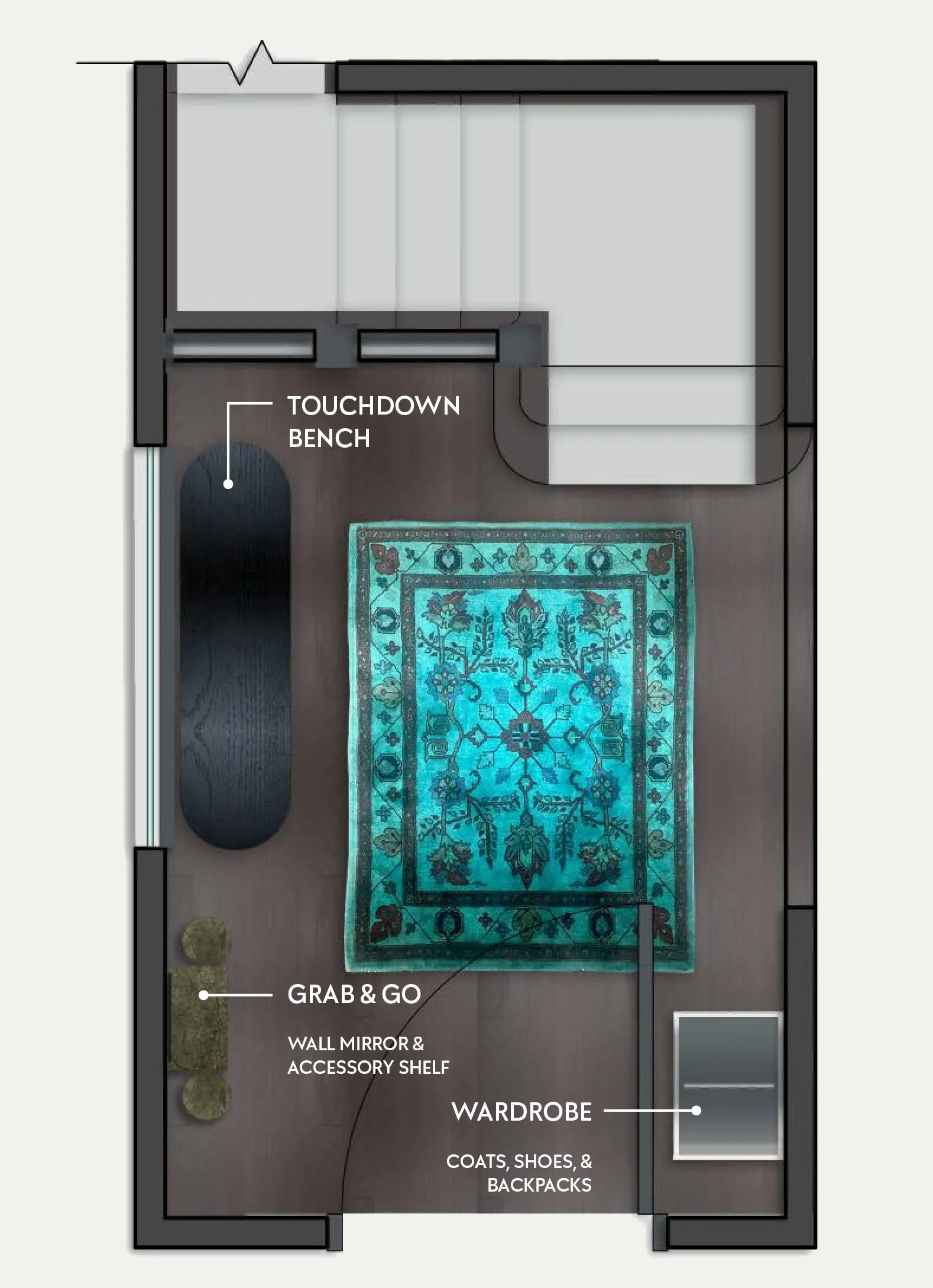 With limited storage and a compact footprint, the entryway presented a design challenge; however thoughtfully defined zones helped streamline the often hectic arrivals and departures of a family of four. A solid wood bench offers a convenient place to put on shoes while also providing an elegant surface for a decorative lamp. A wall mounted Paul McCobb mirror with small pivoting shelves creates an ideal landing spot for mail and car keys. Efficiently located behind the front door, a custom designed USM wardrobe maximizes concealed storage for coats and backpacks, while a vintage overdyed Turkish rug anchors the space.